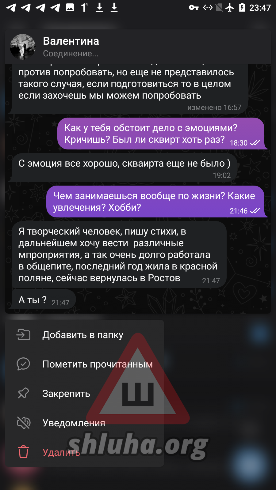 [ подключение к архиву ] [ проверка целостности файла ] [ найден объект: профиль shluha ] [ статус: ДОСЬЕ ОТКРЫТО ]
